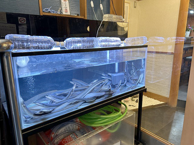 店舗は駅前のビルの2階部分、店内に入ると、鰻の生簀があります。