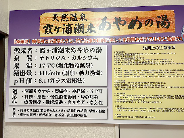 とりあえず温泉で身体をほぐそう。源泉名は霞ヶ浦潮来あやめの湯、泉質はナトリウム・炭酸水素塩冷鉱泉(17.7℃)、ph8.1という温泉スペック。アルカリ性のいわゆる美肌の湯です。