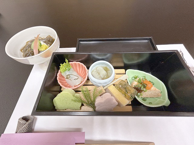 前菜~甘鯛菜の花巻き、鶏松風、煮凝り、海老真丈黄身焼き、たこわさ、鮟肝、青エンドウ寄せ、海老芽寄せ、酢の物として水雲酢。最初からなかなかの品数です。さすが割烹旅館。