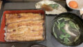 待つこと15分、蒲焼御膳が登場。鰻は鹿児島産を使用しているとのこと。運ばれてきたお盆にはタレの瓶と山椒の瓶が添えられています。重箱が浅いのが特徴的です。