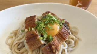 スーパーの鰻を使ったアレンジ鰻レシピ~「うな玉うどん」卵黄をのせて、鰻専門店の鰻のタレをちょっとかけます。ここもスーパーの鰻に付属のタレより、鰻専門店さんのタレの方が美味しいです。今回も浜松のうなぎの井口さんの鰻のタレを使用します。